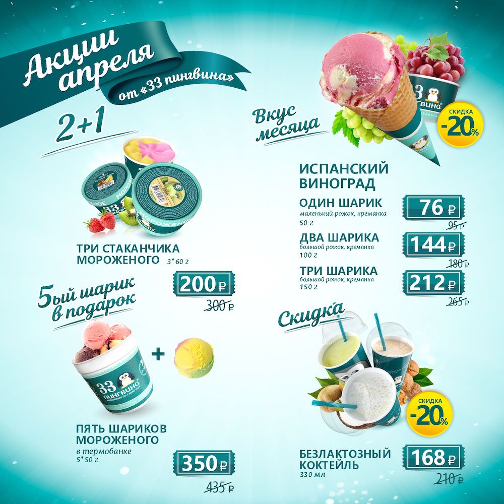 • 2+1: при покупке двух любых стаканчиков мороженого — третий в подарок.